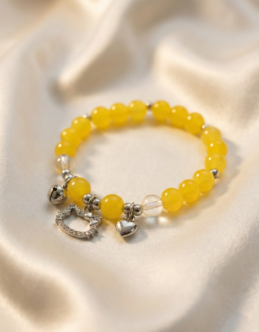 Brighten your wrist with this adorable Sunshine Yellow Beaded Bracelet. Featuring smooth, vibrant yellow beads and accented with a sparkling rhinestone-studded cat silhouette and a puffed silver heart charm, this stretch bracelet adds a playful pop of color to any outfit. A perfect gift for lovers of kawaii accessories and...