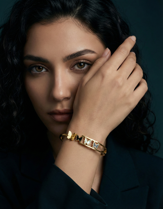 Elevate your wristwear with this elegant gold-plated bangle featuring a trio of delicate butterflies. Accented with classic black and white enamel and a shimmering textured gold finish, this sleek, hinged cuff offers a perfect blend of whimsical charm and modern sophistication.