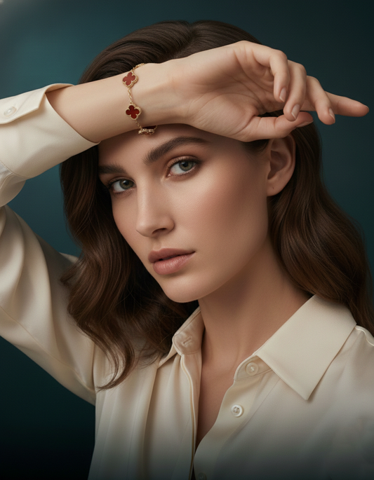 Add a touch of luck and elegance to your look with this dainty gold chain bracelet featuring five red four-leaf clover motifs. Each clover is framed by delicate golden beading, creating a timeless, vintage-inspired aesthetic. Perfect for layering or wearing as a sophisticated solo piece.