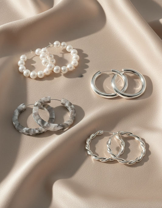 Discover the ultimate wardrobe staple with our Silver Hoop Earrings Trio. This value pack includes three distinct designs: sleek chunky tube hoops, sophisticated pearl-drop circular earrings, and oversized shimmering textured hoops. Whether you are looking for boho-chic jewelry, classic office wear earrings, or a trendy pearl accessory, this combo set...