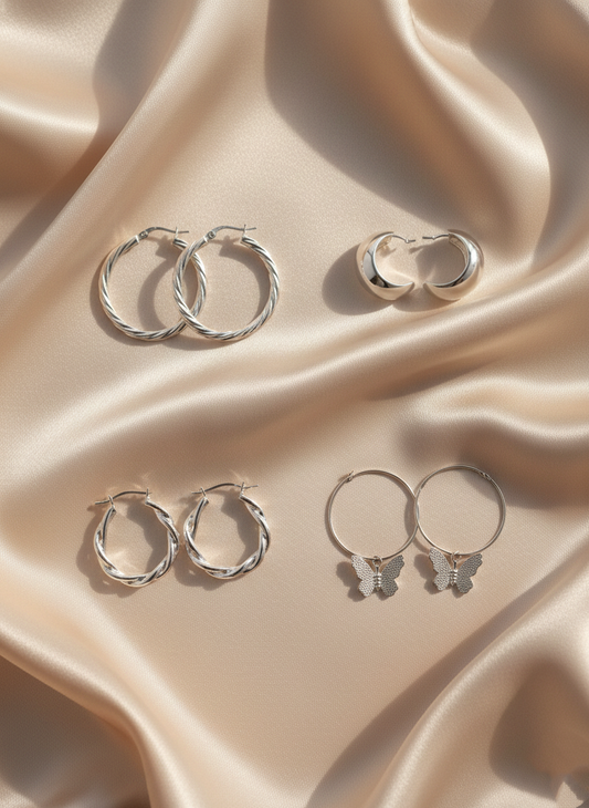Elevate your accessory game with this versatile 4-pair silver hoop earring combo. This curated set includes everything you need for the perfect ear stack or daily rotation: Butterfly Wire Hoops: Delicate large hoops featuring a feminine filigree butterfly charm. Rope Twist Hoops: Classic textured hoops with a braided rope design...