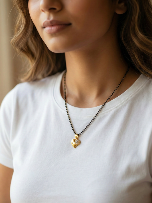 "Elevate your everyday style with this Elegant Gold-Plated Heart Mangalsutra. Designed for the modern woman, this piece blends tradition with contemporary fashion. It features a single strand of classic black beads leading to a charming gold-tone heart pendant, accented with a sparkling American Diamond (AD) for a touch of luxury....