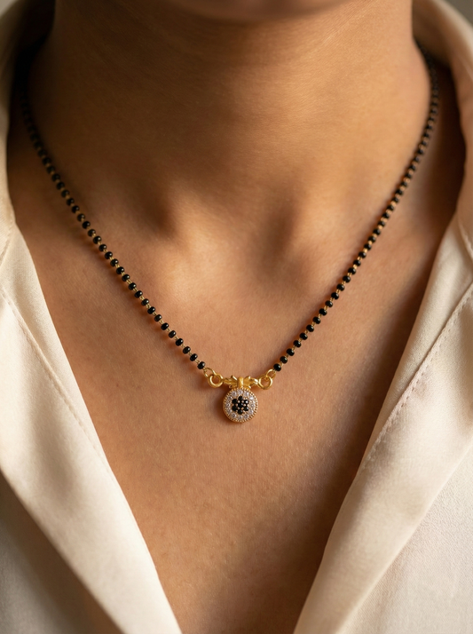 A touch of sparkle to your daily attire with our Modern CZ Stone Mangalsutra. Featuring a chic, diamond-studded pendant design on a slender black bead chain, this piece is the definition of "less is more." It is skin-friendly, lightweight, and crafted to retain its golden shine. A must-have accessory for...