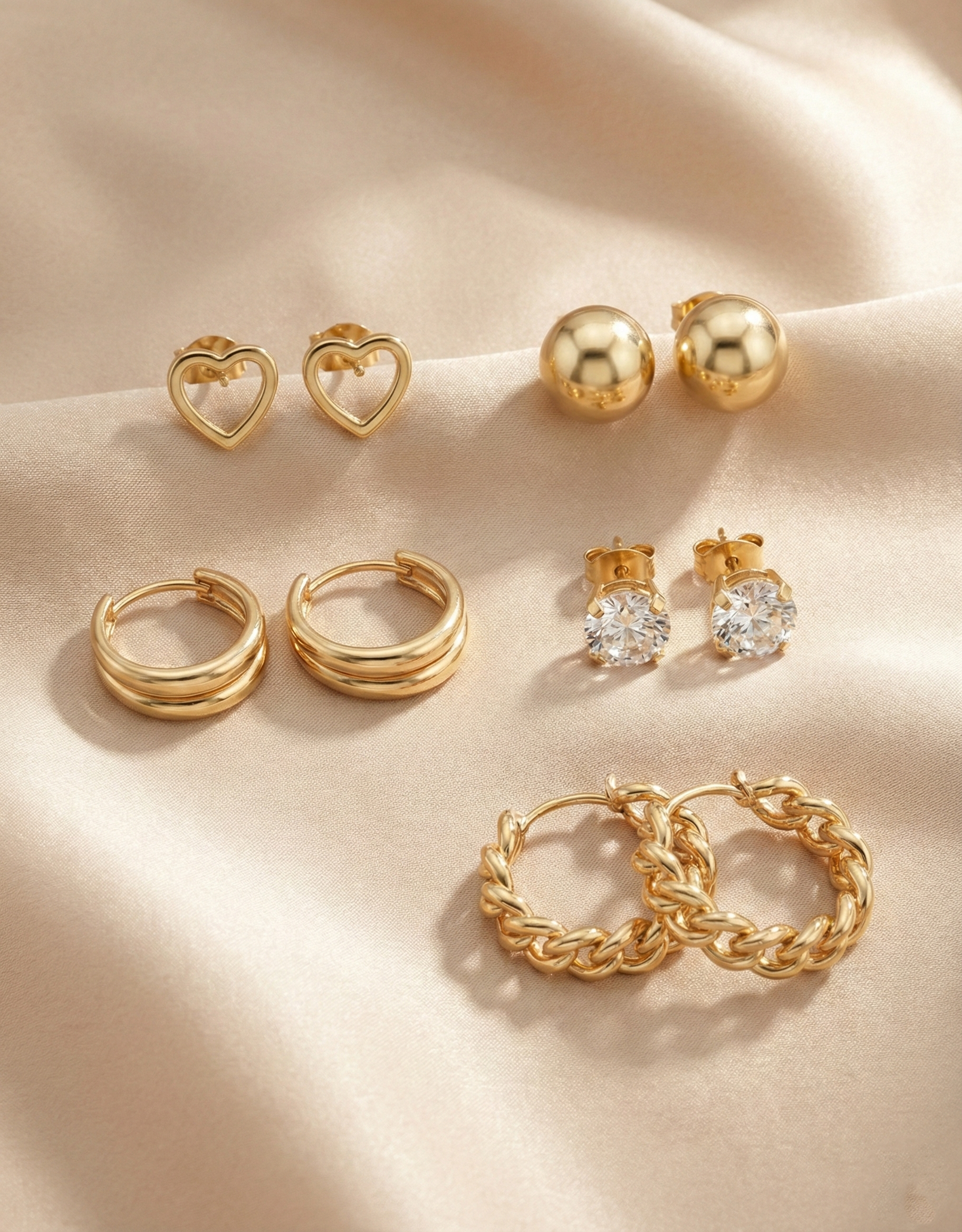 Elevate your daily style with this versatile 5-pair gold earring combo set, designed for the modern fashionista who loves to mix and match. This curated collection features everything you need for a complete ear stack or varied daily looks: