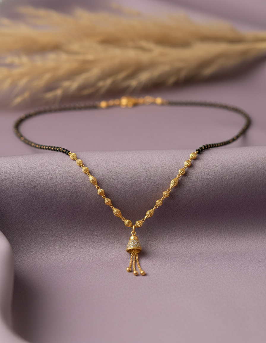 Discover the perfect blend of tradition and trend with this AD Stone Short Mangalsutra. Designed for the modern woman, this piece features a classic single line black bead chain that transitions into elegant gold beads. The centerpiece is a stunning bell-shaped (jhumki) pendant studded with white stones and finished with delicate gold tassels. Lightweight and skin-friendly, it is the ideal daily wear necklace for office or casual outfits.