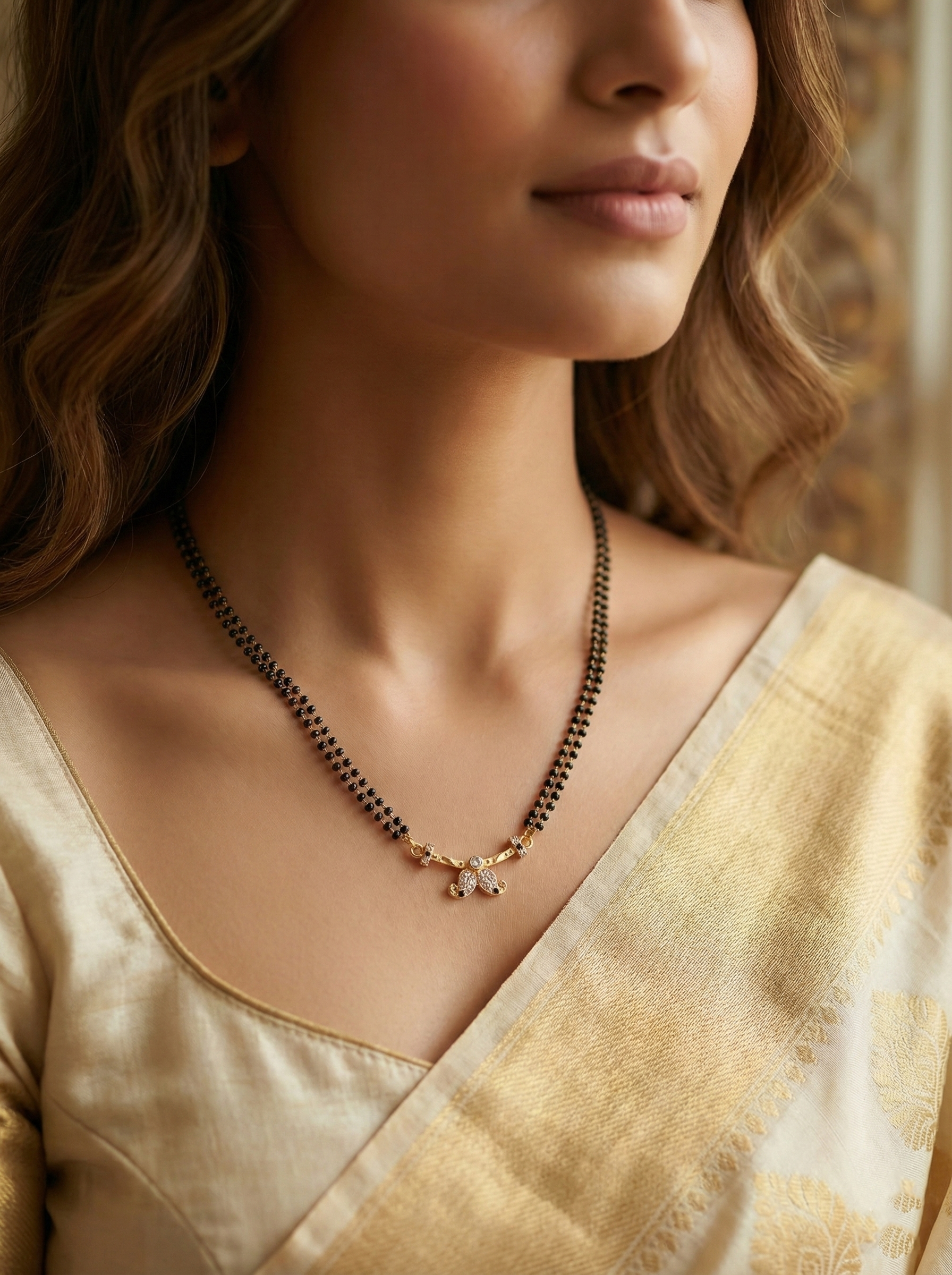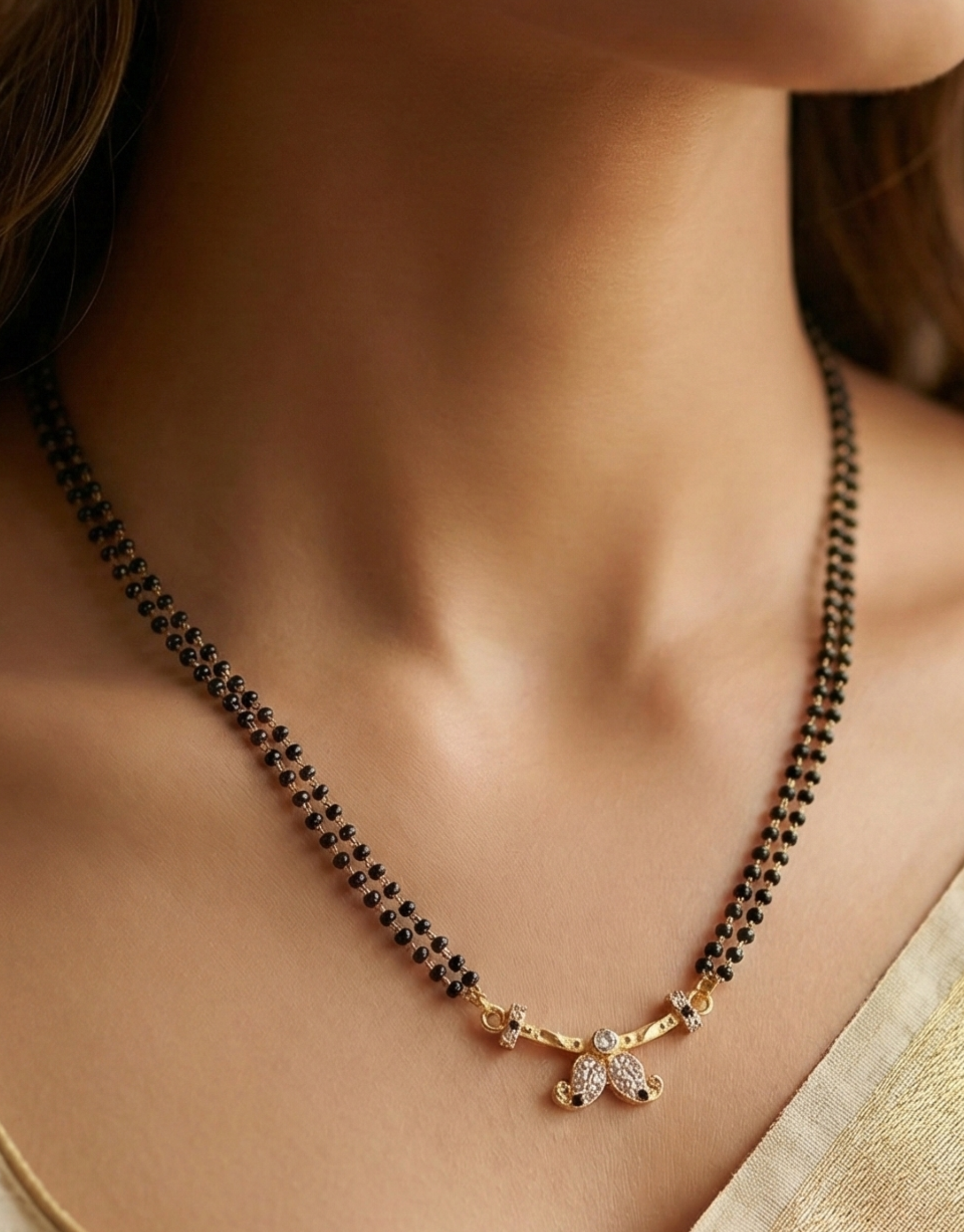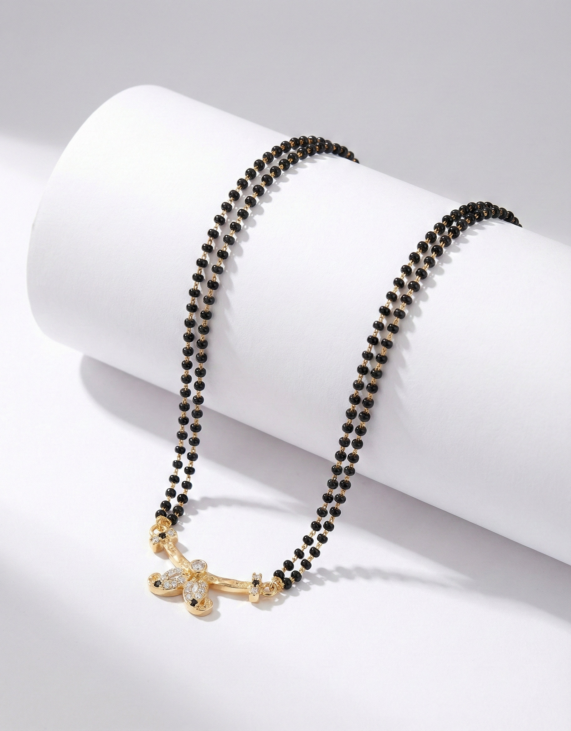 Add a touch of tradition to your neckline with this Double Strand Gold Mangalsutra. Unlike single-chain designs, this piece features two lines of black beads for a fuller, more durable look. The gold-plated curved bar pendant is accentuated with a central crystal motif, offering a classic Tanmaniya style in a short, manageable length. It is perfect for women who prefer a slightly bolder look for daily wear.