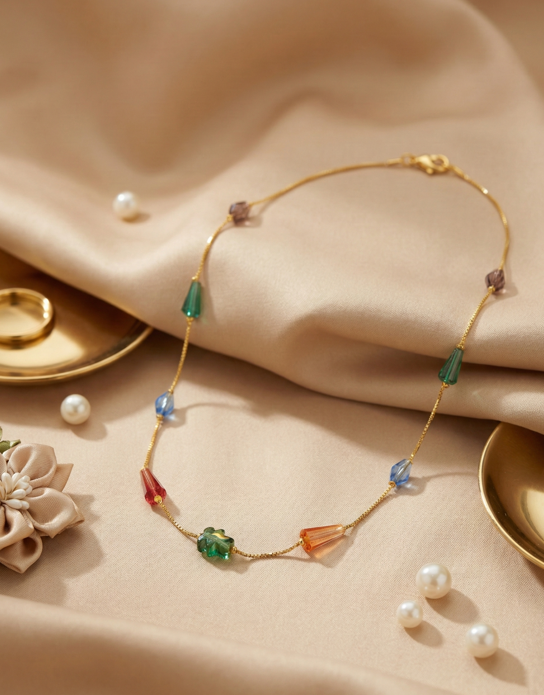 Add a playful pop of color to your everyday style with this Gold-Plated Multicolor Crystal Beaded Chain. Designed for the modern woman, this lightweight necklace features a sleek, gold-toned chain adorned with vibrant, faceted crystal beads in geometric shapes