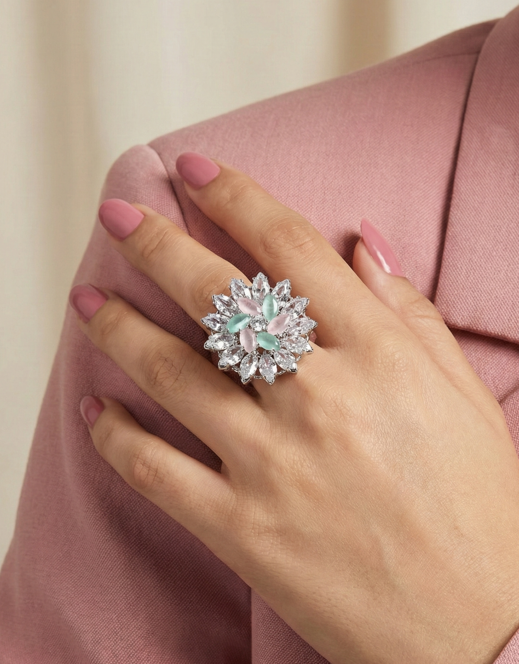 Elevate your jewelry collection with this stunning floral statement ring. Designed with a vibrant burst of clear crystals and soft pastel accents, this piece features an intricate cluster design that captures the light from every angle. Perfect for weddings, special occasions, or adding a touch of elegance to your evening wear.