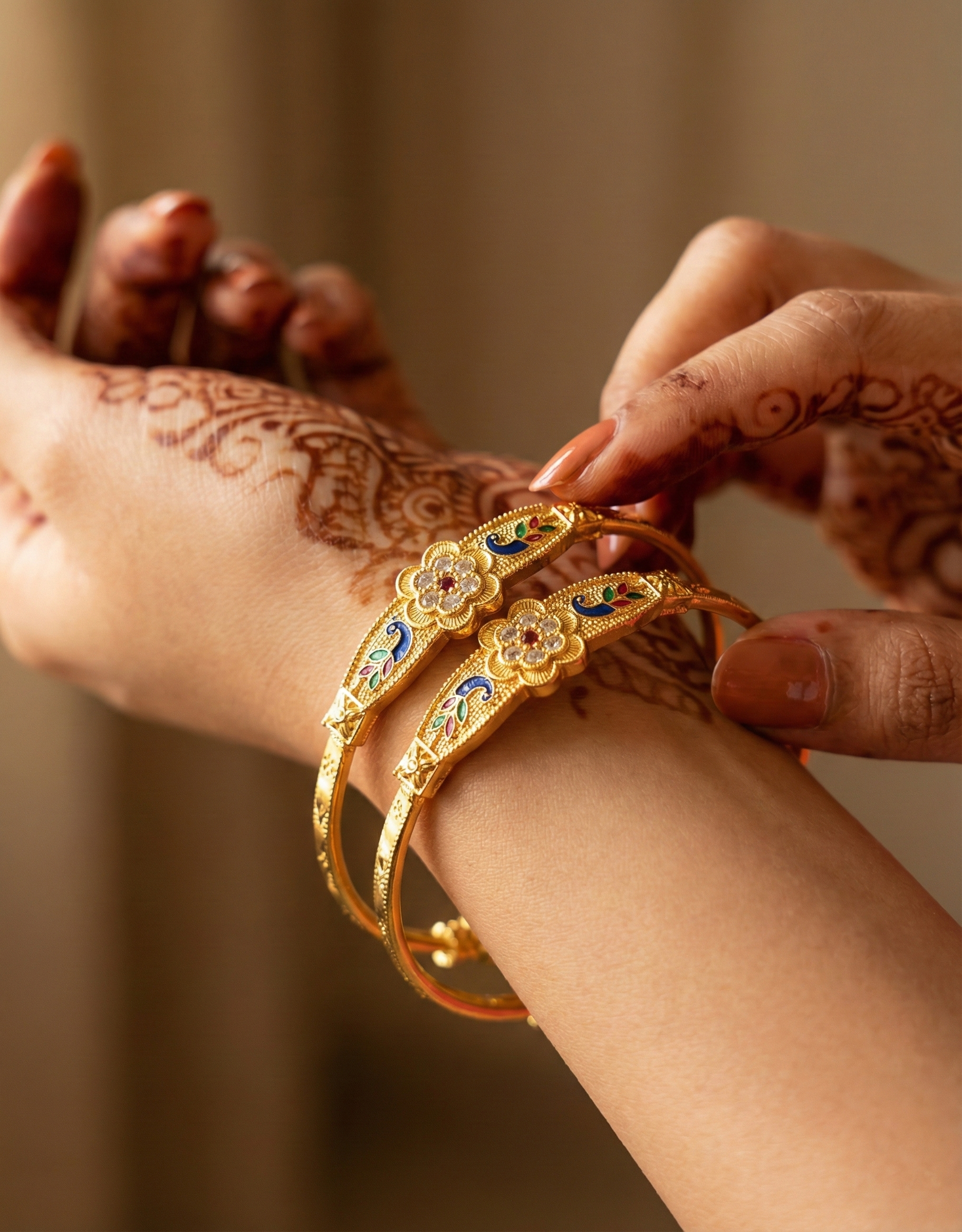 Detailing: Hand-painted multi-color Meenakari (Enamel) work in blue, green, and red.