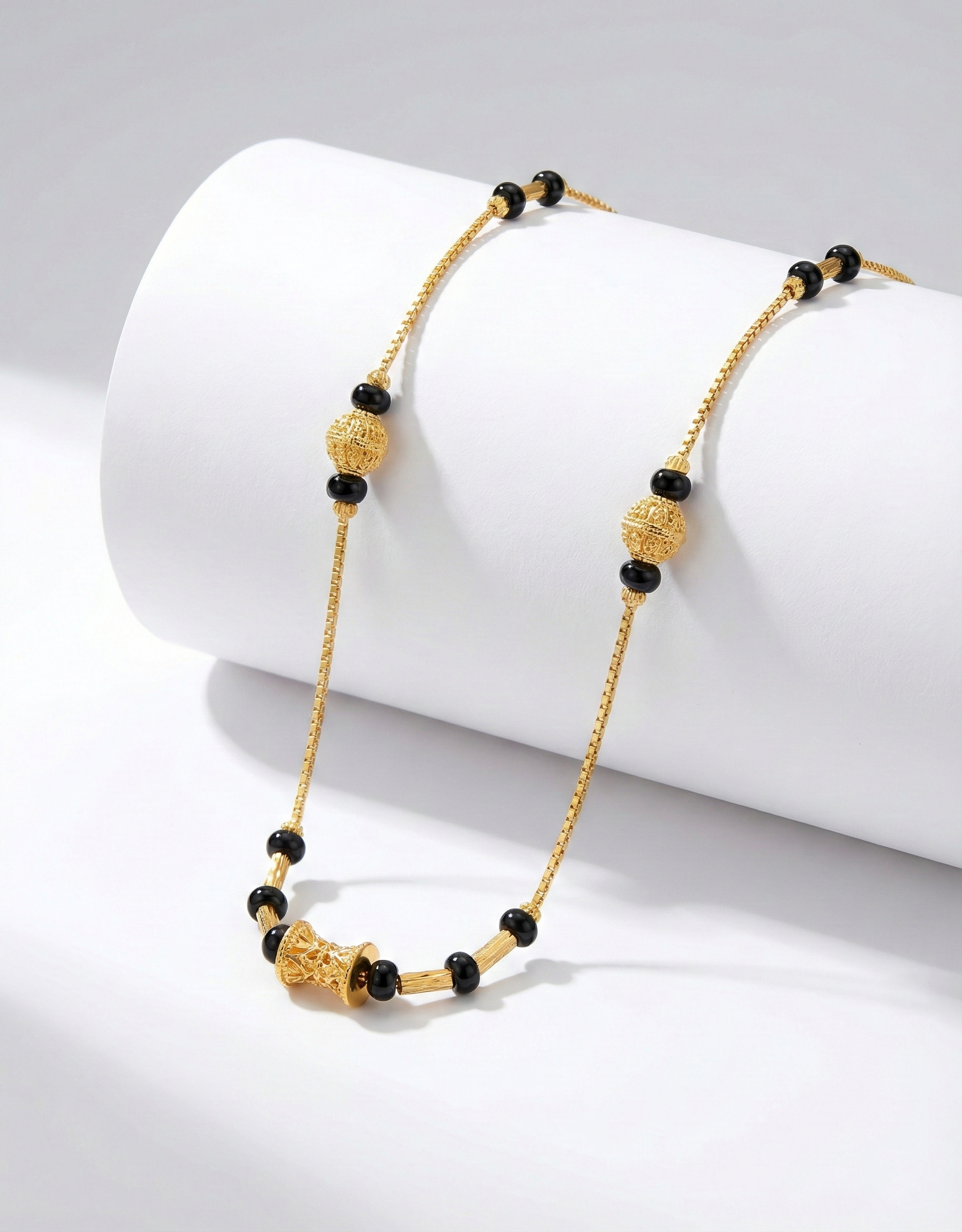 Celebrate tradition with a contemporary twist using this 1 Gram Gold Polish Mangalsutra. This exquisitely crafted necklace combines the sacred significance of black beads with a stylish gold-tone finish. Featuring intricate gold ball accents and a central decorative charm, this short Mangalsutra design is versatile enough to pair with kurtis, sarees, or western wear. A must-have addition to your artificial jewellery collection.