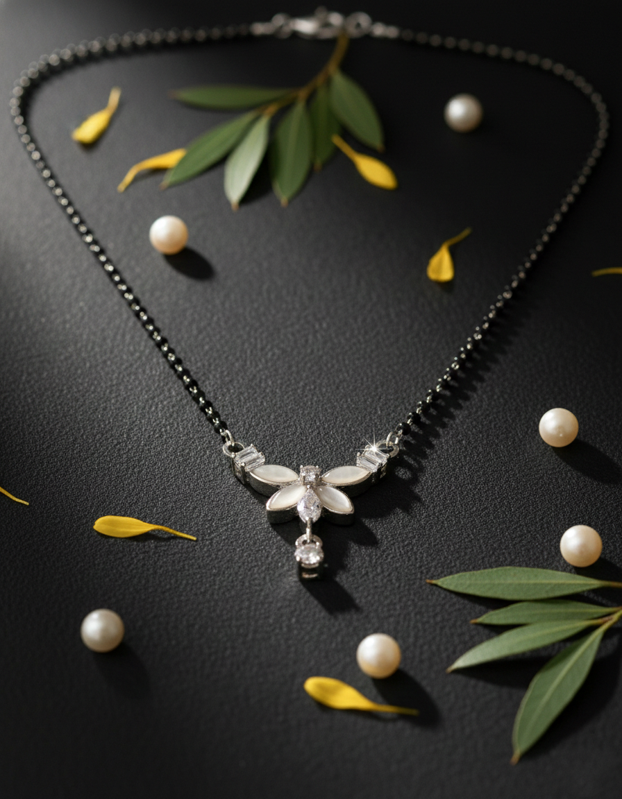 Shine bright with this exquisite Silver Tone AD Mangalsutra. Featuring a single-strand black bead chain, this necklace highlights a stunning floral pendant studded with marquise-cut American Diamonds and a delicate sparkling drop. The rhodium-plated finish gives it a luxurious white gold look, perfect for modern women who love contemporary ethnic jewelry. Ideal for parties, anniversaries, and gifting.