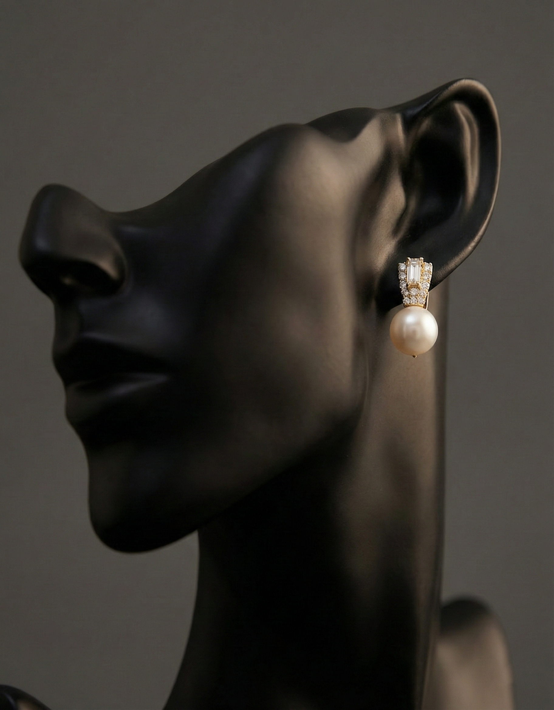 Stone Type: Large round faux/synthetic pearl and baguette-cut clear crystals