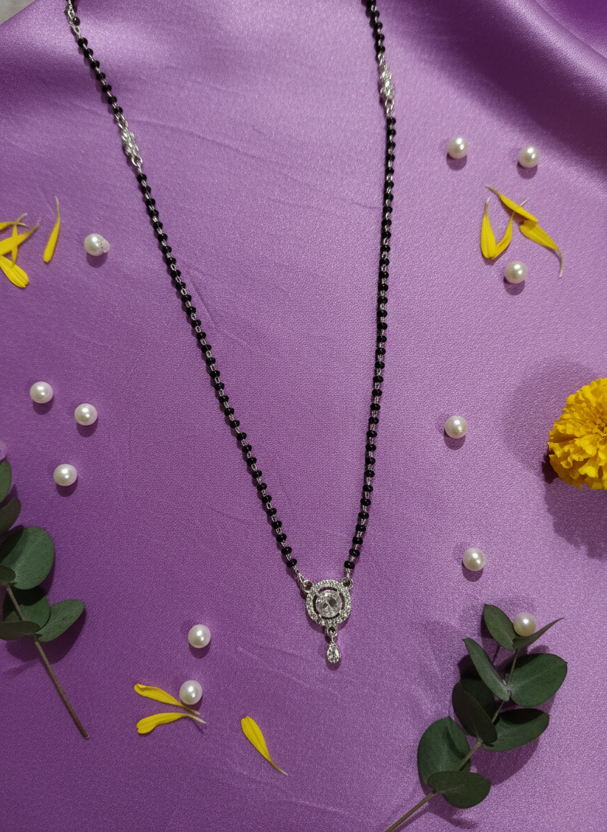 Elevate your everyday style with this minimalist silver-toned mangalsutra, designed for the modern woman. This exquisite piece features a sparkling solitaire American Diamond pendant surrounded by a delicate crystal halo, blending contemporary fashion with traditional sentiment.