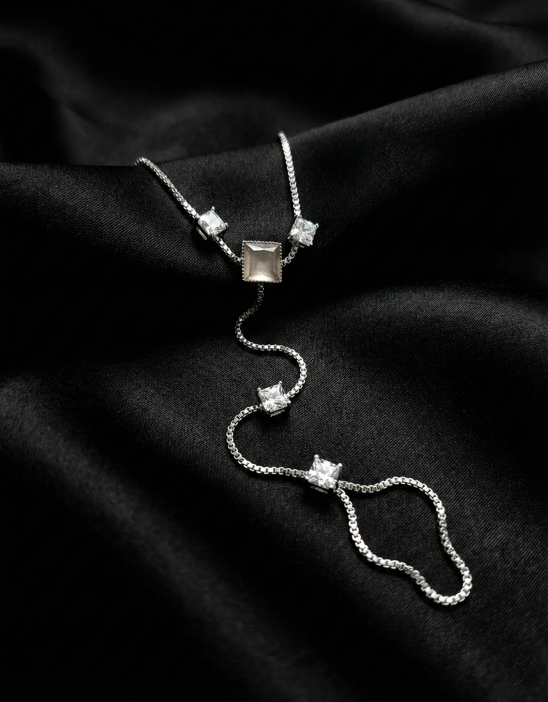 Crafted with a durable silver-toned metal alloy featuring a central square synthetic moonstone (or cat-eye stone) and accented with brilliant princess-cut cubic zirconia crystals. The piece utilizes a fine box chain design for a smooth feel on the skin.
