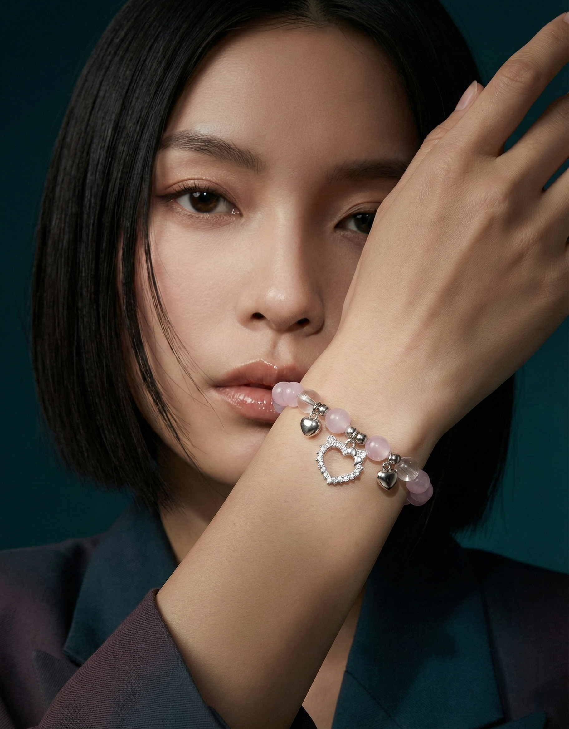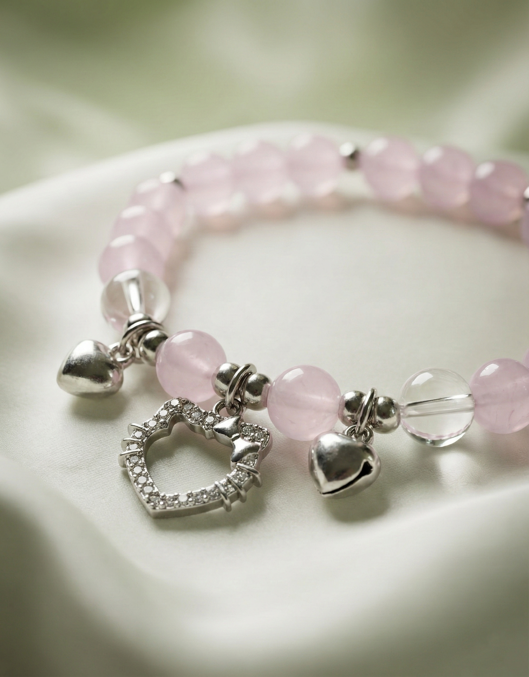 Add a touch of sweetness to any outfit with this adorable pink beaded charm bracelet. Featuring smooth, polished beads in a soft rose quartz hue, this bracelet is highlighted by a collection of playful silver-tone charms, including a sparkling crystal-studded kitty bow, a dainty heart, and a small jingle bell. Perfect for lovers of Kawaii fashion or as a charming gift, it offers a comfortable stretch fit suitable for daily wear.