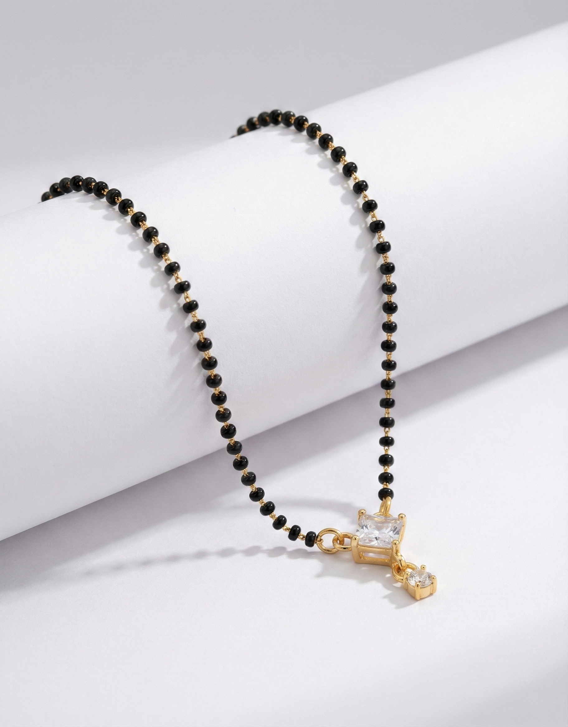 "Discover elegance in simplicity with this Solitaire Geometric Drop Mangalsutra. This sophisticated piece features a brilliant square-cut American Diamond (AD) pendant with a tiny crystal drop, offering a look of understated luxury. The short black bead chain is designed for comfort, making it an ideal choice for daily wear or as a subtle accessory for western and ethnic outfits. A timeless design for those who love minimalist jewellery."