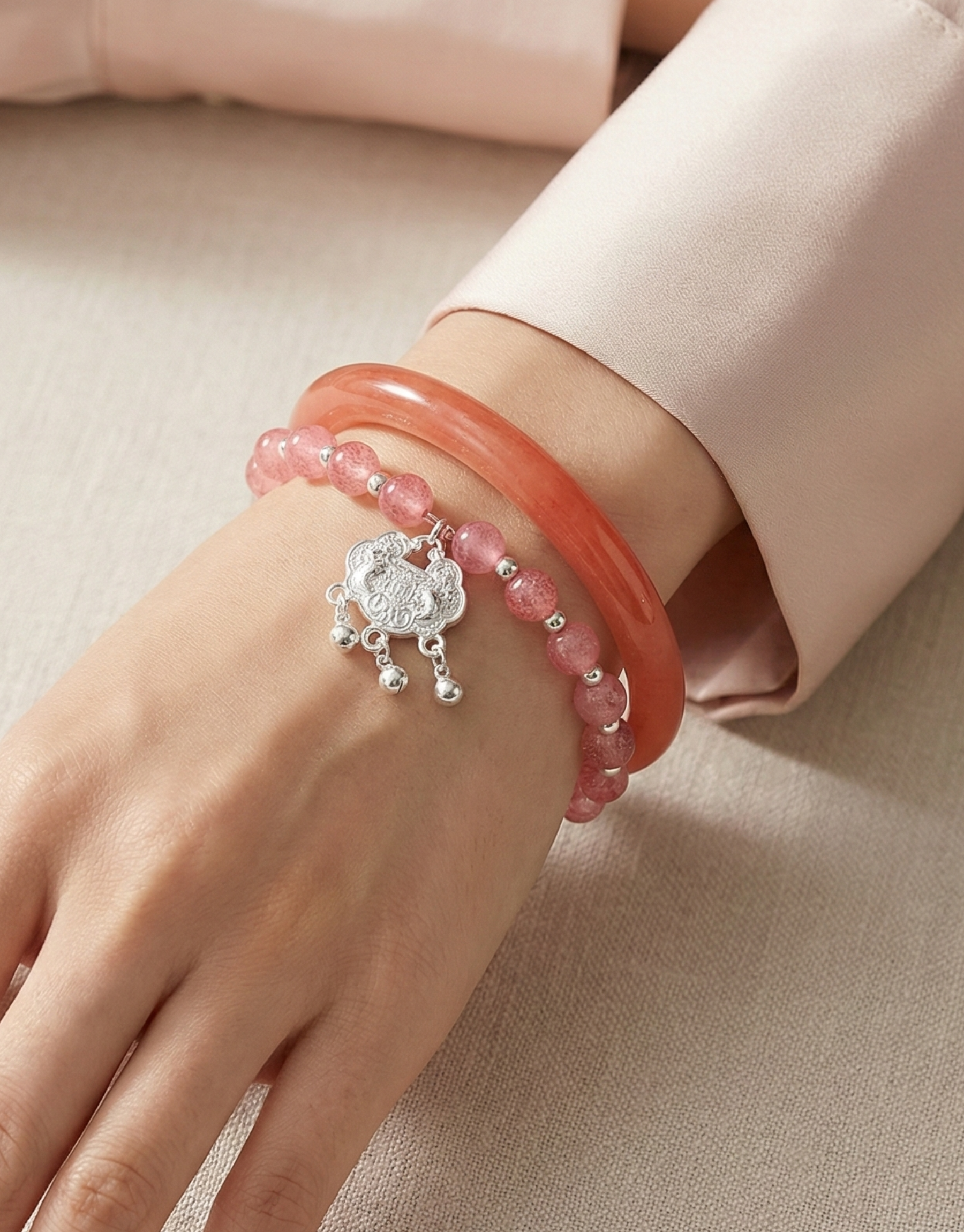 A romantic and meaningful jewelry set featuring the soft hues of pink quartz. Includes a classic solid bangle and a beaded bracelet adorned with a traditional silver luck charm. The translucent stone finish catches the light beautifully, making it an ideal accessory for daily wear or a thoughtful spiritual gift.